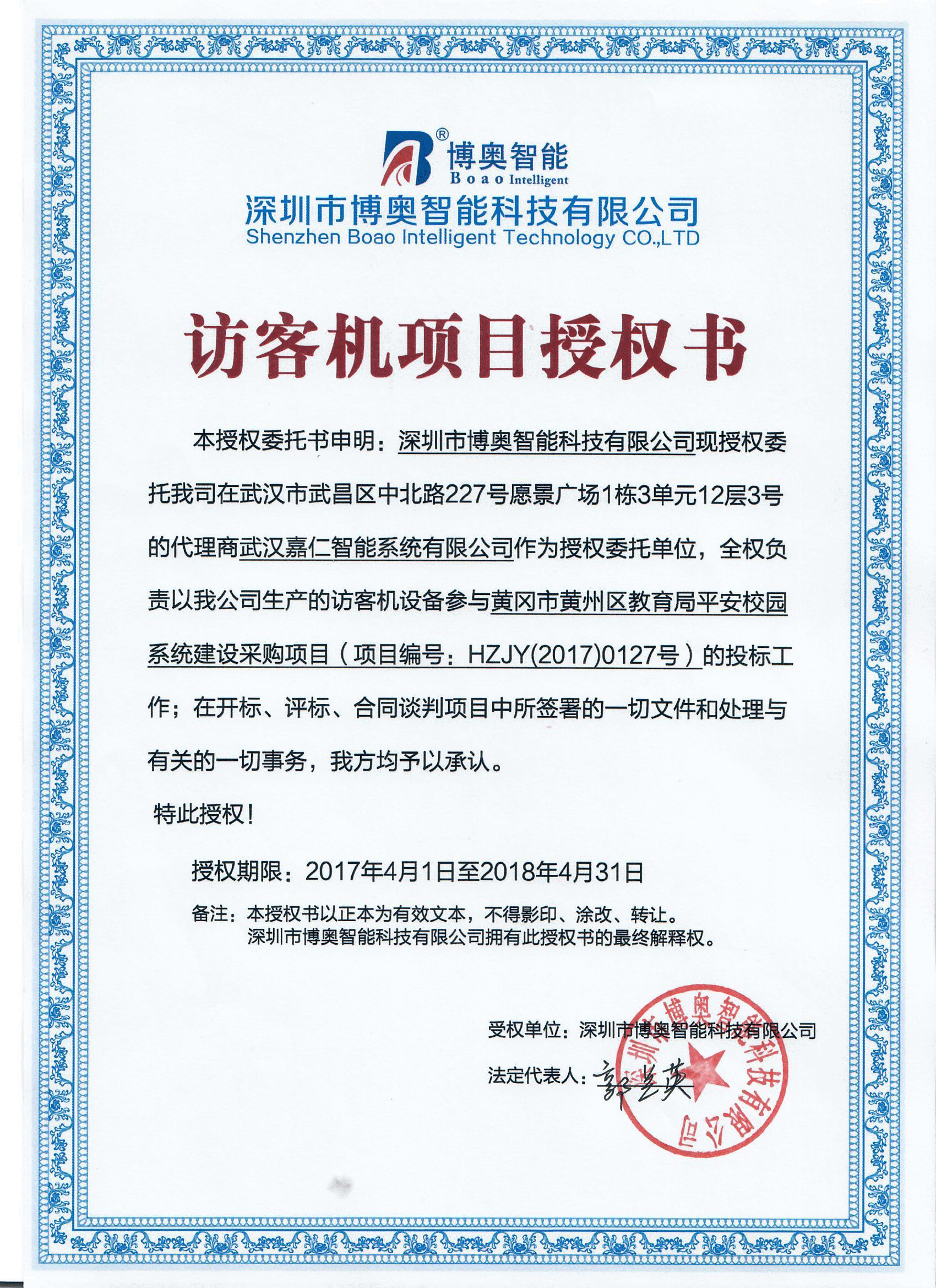 現授權我公司訪客機武漢代理商武漢嘉仁智能系統有限公司參與黃岡市黃州區教育局平安校園系統建設采購項目中的訪客登記管理系統投標工作,訪客登記管理系統包含訪客機設備和訪客登記管理軟件。