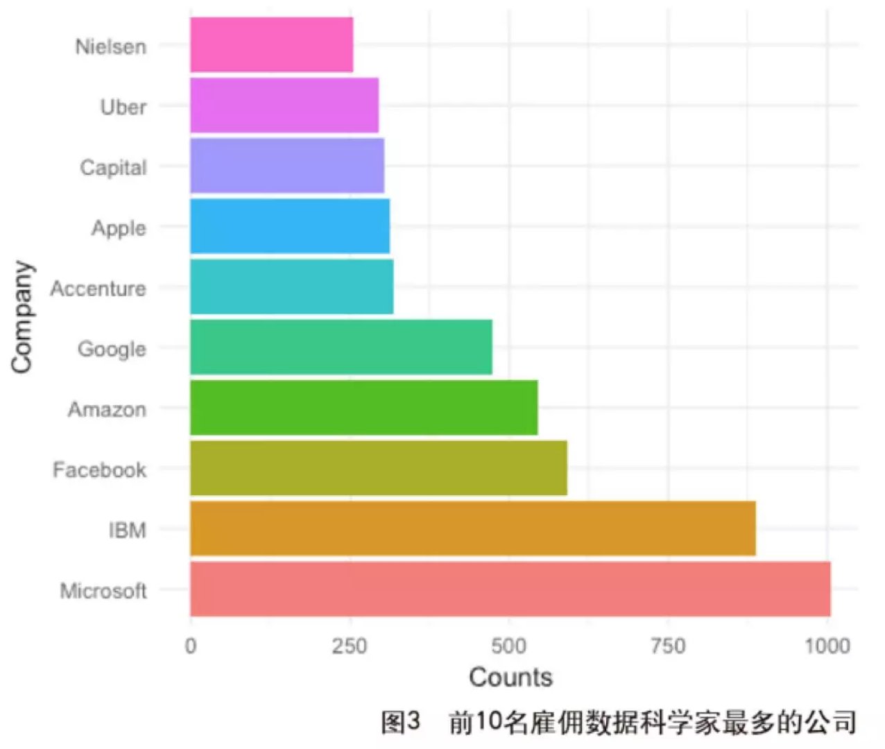 我們從數據上看看數據科學的現狀吧。從最大的職業社交網站領英( LinkedIn )的數據看來,數據科學家職位的年薪在7.5萬~17萬美元之間,中位數是11.3萬美元。其中雇傭數據科學家的公司主要集中在微軟、IBM、Fackbook、亞馬遜、Google這些計算機互聯網公司,圖3 為前10名雇傭數據科學家最多的公司。