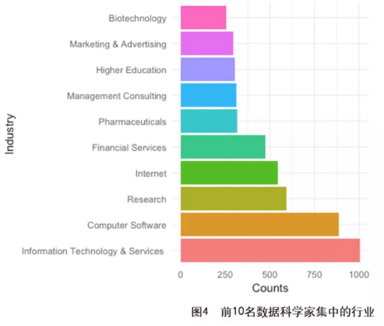 數據科學家所處的行業也集中在科技或者研究性組織,圖4是排名前10的行業。