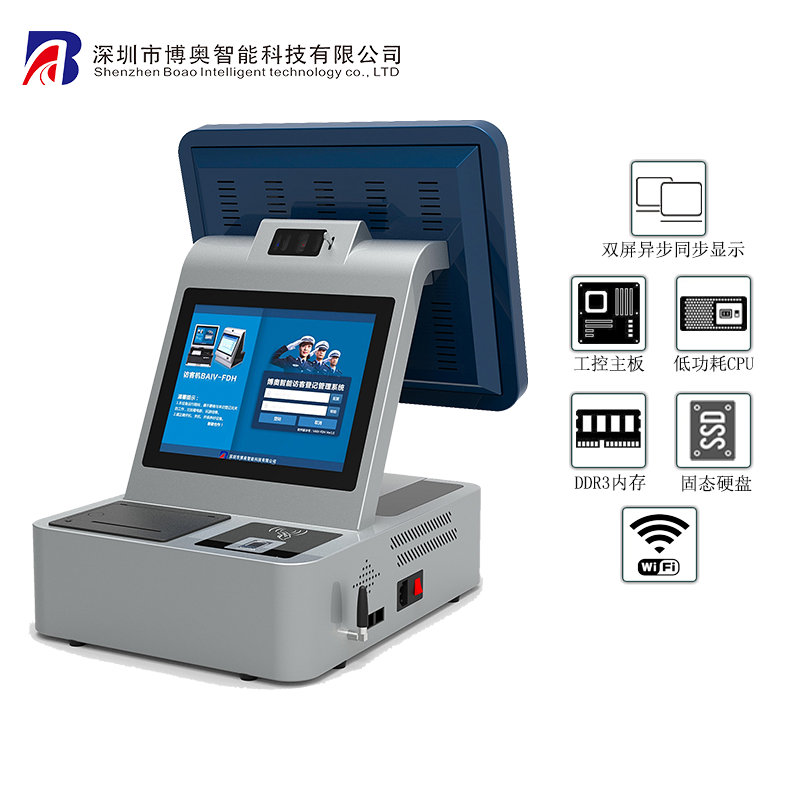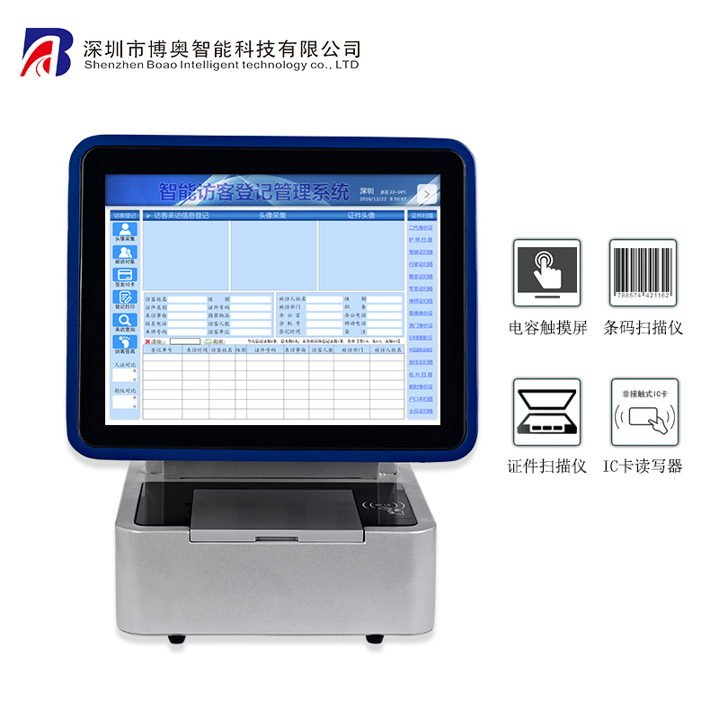 15寸雙屏智能訪客機BA-IVB1是我公司研新一代高端智能訪客登記管理設(shè)備,整機符合人體工程設(shè)計,機身小巧,外形新穎、美觀、簡潔,內(nèi)部模塊化設(shè)計、維護(hù)方便;采用多點電容觸摸屏設(shè)計,點擊靈敏、操作方便,支持雙屏同步顯示和異步顯示,集成證件OCR掃描識別、身份證讀取,IC卡讀寫、人臉抓拍比對、指紋采集比對、條碼掃描、訪客單打印等功能,能夠迅速的完成訪客登記保存查詢工作。