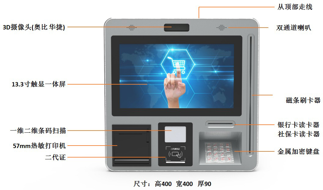 壁掛式社保一體機(jī)是博奧智能專為社保局、醫(yī)院、藥店等場所設(shè)計加工的一款集成多功能終端,采用安安卓系統(tǒng);本產(chǎn)品集成13.3寸觸顯一體屏、3D攝像頭(支持奧比、華捷)、熱敏打印機(jī)、身份證閱讀器、社保卡銀行卡讀卡器、磁條刷卡器、一維二維碼掃描、密碼銀行等模組,主要用來實現(xiàn)社保查詢、醫(yī)療繳費(fèi)、購買藥品等。