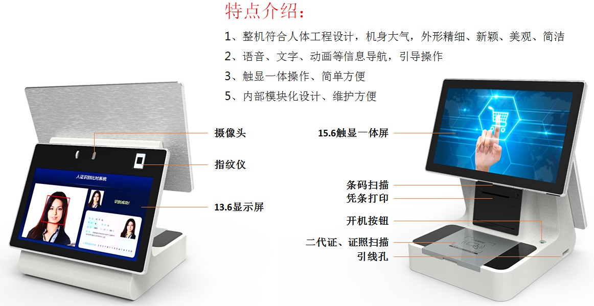 BA-FK0A訪客機是博奧智能針對政府機關、軍隊、公安、法院、學校、事業(yè)單位、花園小區(qū)、高檔寫字樓、工廠等門衛(wèi)傳達室設計加工的來訪人員信息化自動登記設備, 從而代替了傳統(tǒng)的手工登記,有效的提高了門衛(wèi)管理工作效率及證件信息登記準確性;日后查詢來訪人員信息更方便快捷;整機符合人體工程設計,機身小巧,外形新穎、美觀、簡潔,內(nèi)部模塊化設計、維護方便;采用多點電容觸摸屏設計,點擊靈敏、操作方便,支持雙屏同步顯示和異步顯示,集成證件OCR掃描識別、身份證讀取,IC卡讀寫、人臉抓拍比對、指紋采集比對、條碼掃描、訪客單打印等功能