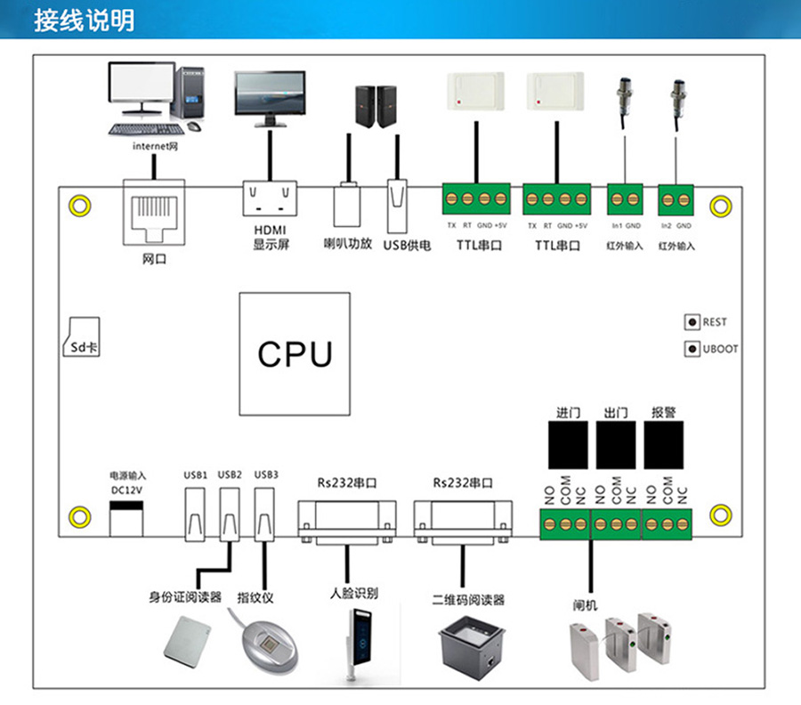 通道閘機(jī)門禁人臉識(shí)別指紋采集識(shí)別條碼掃描身份證閱讀機(jī)具讀卡器多功能控制板
