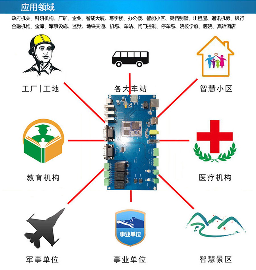 產(chǎn)品用途:政府機(jī)關(guān)、科研機(jī)構(gòu)、廠礦、企業(yè)、智能大廈、寫字樓、辦公樓、智能小區(qū)、高檔別墅、出租屋、通訊機(jī)房、銀行金融機(jī)構(gòu)、金庫、軍事設(shè)施、監(jiān)獄、地鐵交通、機(jī)場(chǎng)、車站、閘門控制、停車場(chǎng)、院校學(xué)府、醫(yī)院、賓館酒店
