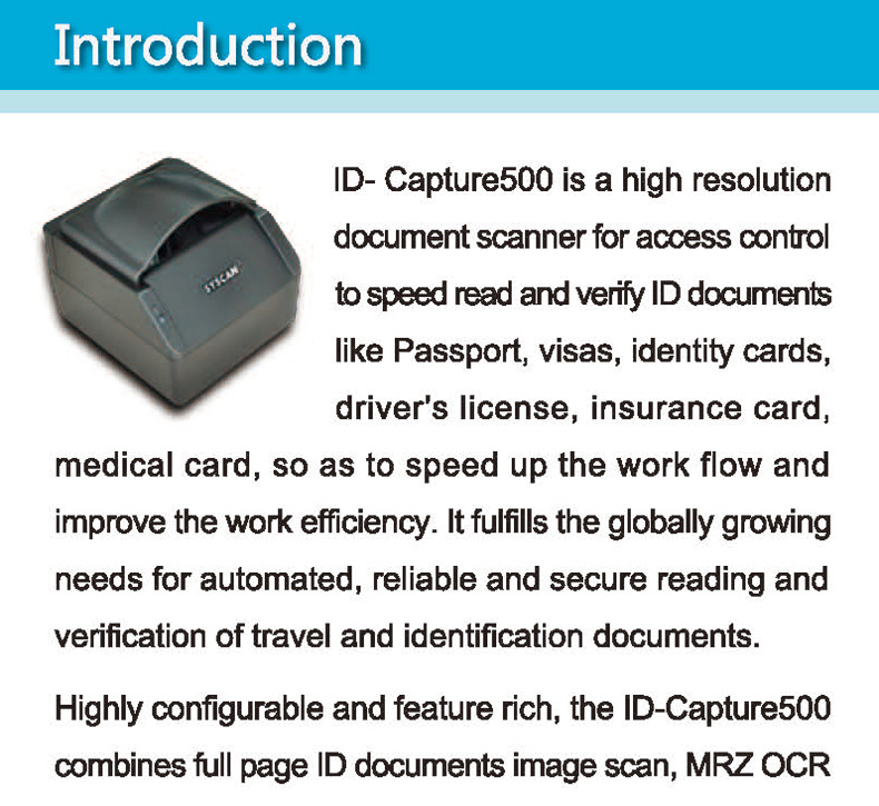 This is a high resolution document scanner for access control to speedread and verify ID documents like Passport, visas, identity cards, driver’s license, insurance card, medical card, so as to speed up the work flow and improve the work efficiency. It fulfills the globally growing needs for automated