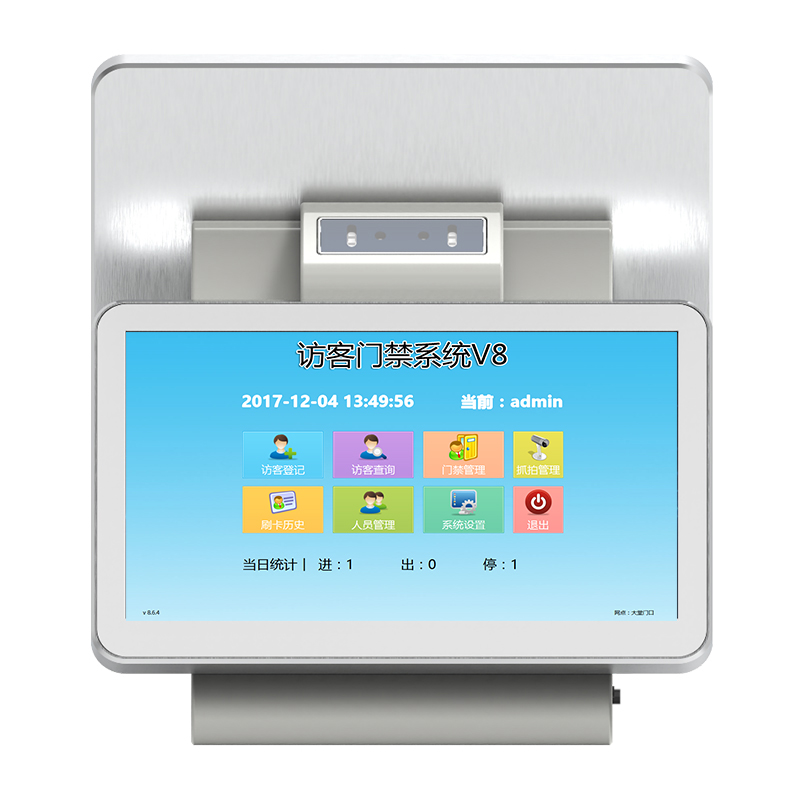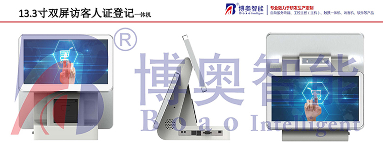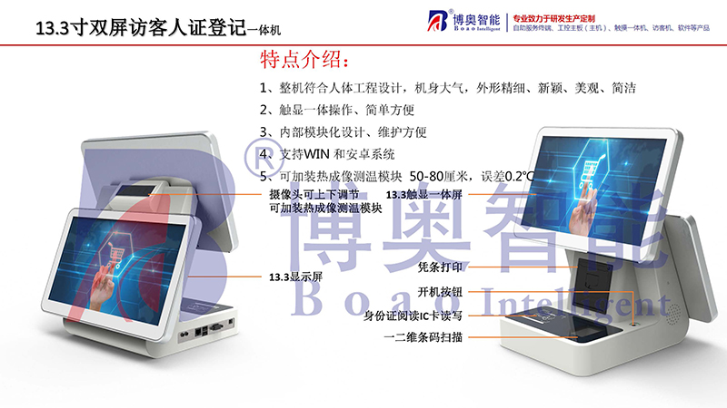 BA-FK13A訪客機是博奧智能針對政府機關、軍隊、公安、法院、學校、事業單位、花園小區、高檔寫字樓、工廠等門衛傳達室設計加工的一款進出人員信息化登記設備, 從而代替了傳統的手工登記,有效的提高了門衛管理工作效率及證件信息登記準確性, 為日后的信息查詢工作更方便量更快捷。整機采用流線性設計,符合人體工程原理,結構合理,外形美觀大方,操作簡單,維護方便;內部采用模塊化設計,集成13.3寸電容觸顯一體屏和13.3寸液晶屏、身份證閱讀器,IC卡讀寫器、雙目寬動態高清攝像頭、條碼掃描儀、熱敏打印機及熱成像測溫等模塊。
