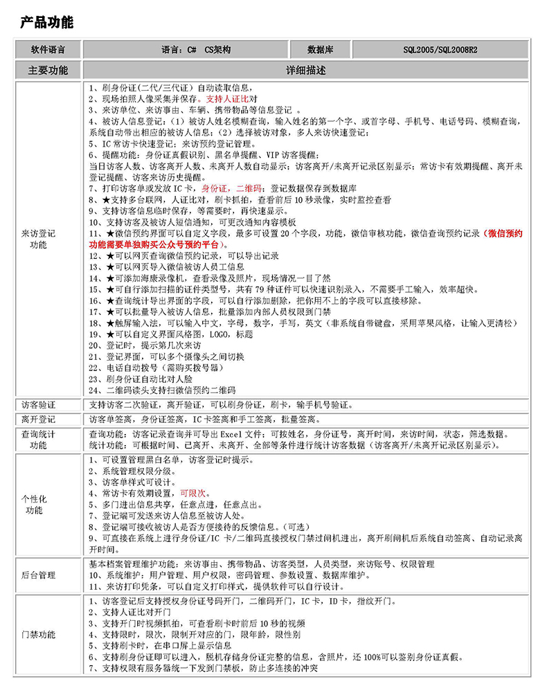 1、刷身份證(二代/三代證)自動讀取信息, 2、現場拍照人像采集并保存。支持人證比對 3、來訪單位、來訪事由、車輛、攜帶物品等信息登記 。 4、被訪人信息登記:(1)被訪人姓名模糊查詢,輸入姓名的第一個字、或首字母、手機號、電話號碼、模糊查詢,系統自動帶出相應的被訪人信息;(2)選擇被訪對象,多人來訪快速登記; 5、IC常訪卡快速登記;來訪預約登記管理。 6、提醒功能:身份證真假識別、黑名單提醒、VIP訪客提醒; 當日訪客人數、訪客離開人數、未離開人數自動顯示;訪客離開/未離開記錄區別顯示;常訪卡有效期提醒、離開未登記提醒、訪客來訪歷史提醒。 7、打印訪客單或發放IC卡,身份證,二維碼;登記數據保存到數據庫 8、★支持多臺聯網,人證比對,刷卡抓拍,查看前后10秒錄像,實時監控查看 9、支持訪客信息臨時保存,等需要時,再快速顯示。 10、支持訪客及被訪人短信通知,可更改通知內容模板 11、★微信預約界面可以自定義字段,最多可設置20個字段,功能,微信審核功能,微信查詢預約記錄(微信預約功能需要單獨購買公眾號預約平臺)。 12、★可以網頁查詢微信預約記錄,可以導出記錄 13、★可以網頁導入微信被訪人員工信息 14、★可添加海康錄像機,查看錄像及照片,現場情況一目了然 15、★可自行添加掃描的證件類型號,共有79種證件可以快速識別錄入,不需要手工輸入,效率超快。 16、★查詢統計導出界面的字段,可以自行添加刪除,把你用不上的字段可以直接移除。 17、★可以批量導入被訪人信息,批量添加內部人員權限到門禁 18、★觸屏輸入法,可以輸入中文,字母,數字,手寫,英文(非系統自帶鍵盤,采用蘋果風格,讓輸入更清松) 19、★可以自定義界面風格圖,LOGO,標題 20、登記時,提示第幾次來訪 21、登記界面,可以多個攝像頭之間切換 22、電話自動撥號(需購買撥號器) 23、刷身份證自動比對人臉 24、二維碼讀頭支持掃微信預約二維碼 |