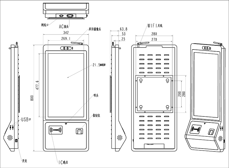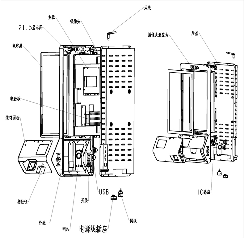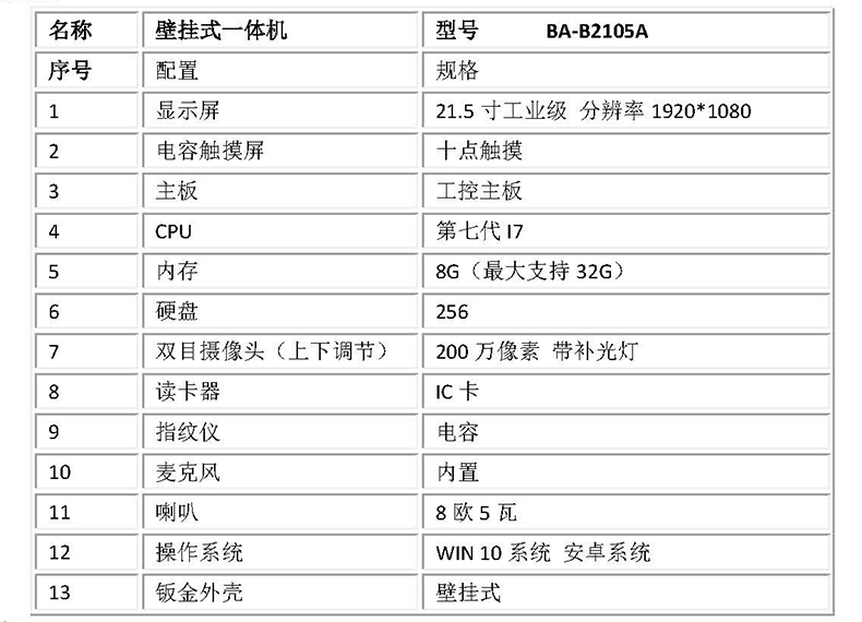 ? ?? ? BA-B2105A多功能壁掛式觸摸一體機(jī)支持WIN系統(tǒng)和安卓系統(tǒng),模塊化設(shè)計,結(jié)構(gòu)合理;主要集成21.5寸高分辨率顯示屏、防爆多點電容觸摸、寬動態(tài)高清雙目攝像頭、IC卡讀寫器、指紋儀,并且根據(jù)功能需求可配置身份證閱讀器、熱敏小票打印機(jī)、條碼掃描儀等配件;?外殼采購鈑金材質(zhì),結(jié)實牢固;表面采用烤漆工藝,外觀精美實用,搭配各類軟件可適用于多種場合,比如酒店自助入助登記終端,商場自助收銀終端,高檔小區(qū)門衛(wèi)寫字樓大廳前臺用于來訪人員登記管理終端等。