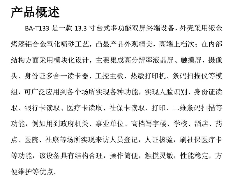 BA-T133是一款13.3寸臺(tái)式多功能雙屏終端設(shè)備,外殼采用鈑金烤漆鋁合金氧化噴砂工藝,凸顯產(chǎn)品外觀精美,高端上檔次;在內(nèi)部結(jié)構(gòu)方面采用模塊化設(shè)計(jì),主要集成高分辨率液晶屏、觸摸屏,攝像頭、身份證多合一讀卡器、工控主板、熱敏打印機(jī)、條碼掃描儀等模組,可廣泛應(yīng)用到各個(gè)場(chǎng)所實(shí)現(xiàn)各種功能,實(shí)現(xiàn)人臉識(shí)別、身份證讀取、銀行卡讀取、醫(yī)療卡讀取、社保卡讀取、打印、二維條碼掃描等功能,例如用到政府機(jī)關(guān)、事業(yè)單位、高檔寫字樓、學(xué)校、酒店、藥點(diǎn)、醫(yī)院、社康等場(chǎng)所實(shí)現(xiàn)來(lái)訪人員登記,人證核驗(yàn),刷社保醫(yī)療卡等功能,該設(shè)備具有結(jié)構(gòu)合理,操作簡(jiǎn)便,觸摸靈敏,性能穩(wěn)定,方便維護(hù)等優(yōu)點(diǎn).