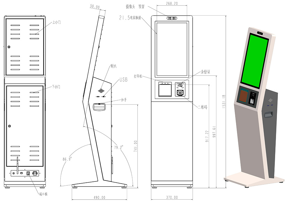 21.5寸多功能一體采用鈑金外殼,表面烤漆工藝,外觀精致;結構設計合理,易操作,方便維護,主要集成21.5寸觸摸一體屏,雙目攝像頭,身份證閱讀器,IC卡讀器,打印機,條碼掃描等模塊,產品支持功能定制及結構外觀設計;多功能一體機可用于各種場景做為訪客登記系統,人證比對系統,排隊叫號系統;比如門衛,辦事大廳醫院等。為了方便代理加盟和系統集成商應用,產品可整機和套件銷售,客戶根據需求可選安卓系統和WIN系統