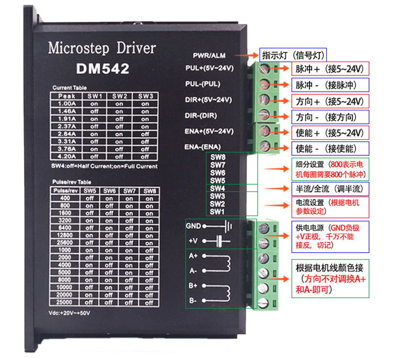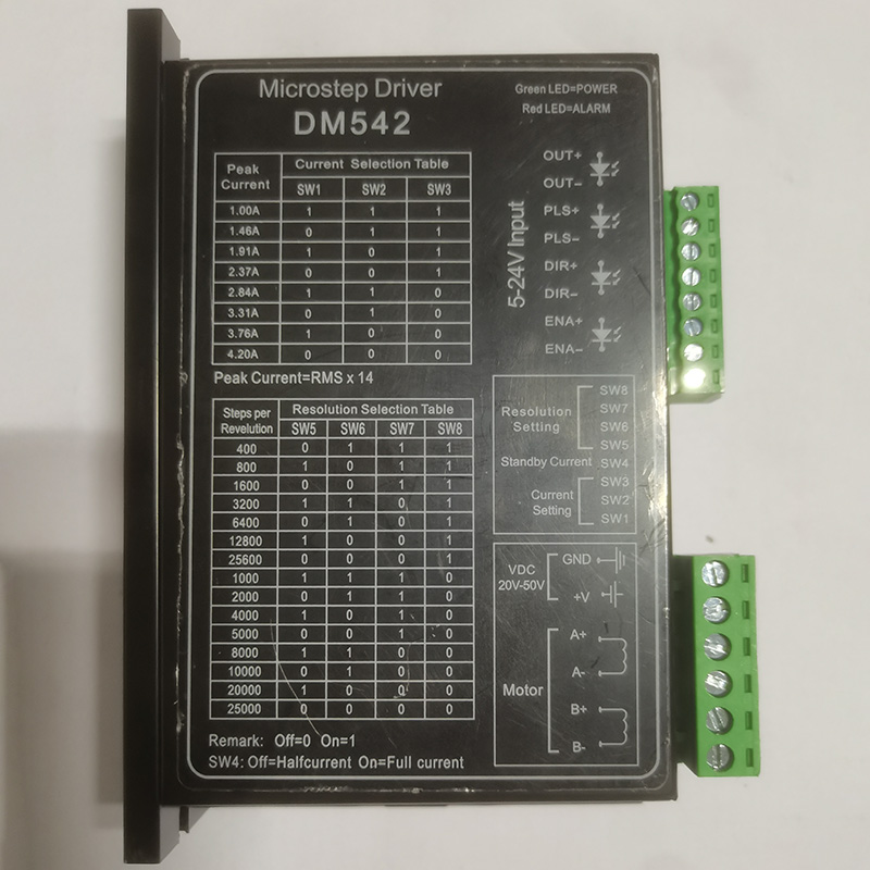 DM542 DSP 控制的數字式兩相混合式步進電機驅動器,適配相電流在 4.2A 以下、外徑 39,42,57,60,86mm 的四線,六線,八線兩相混合式步進電機。可設置128 內各種細分以及 4.2A 內各種電流,內部增加電機專用控制算法,能夠針對不同電機采用相應運行參數,使電機運行非常平穩,震動以及噪聲極小。 內置過熱,過流,過壓檢測,保護驅動器穩定運行。