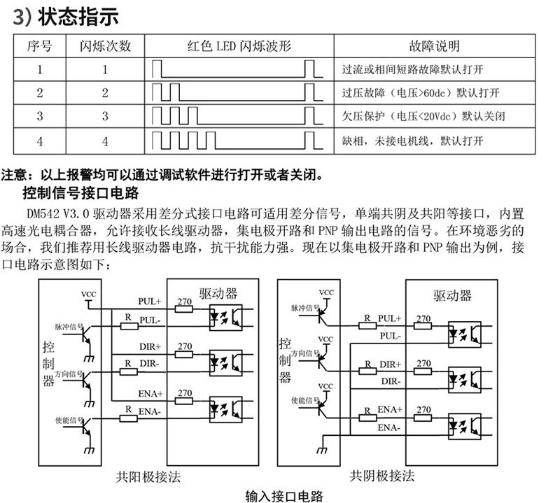 使能控制信號 此輸入信號用于使能或禁止驅動器輸出。ENA 接低電平(或內部光耦導通)時,驅動器將切斷電機各相的電流使電機處于自由狀態, 不響應步進脈沖。當不需用此功能時,使能信號端懸空即可。5-24VDC 電平兼容。 |