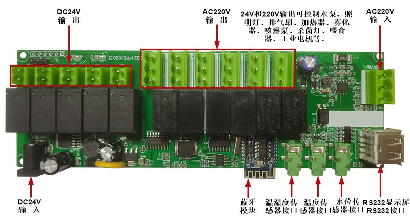 可控制水泵、照明燈、排氣扇、加熱器、霧化器、噴淋泵、殺菌燈、喂食器、馬達、工業設備等。