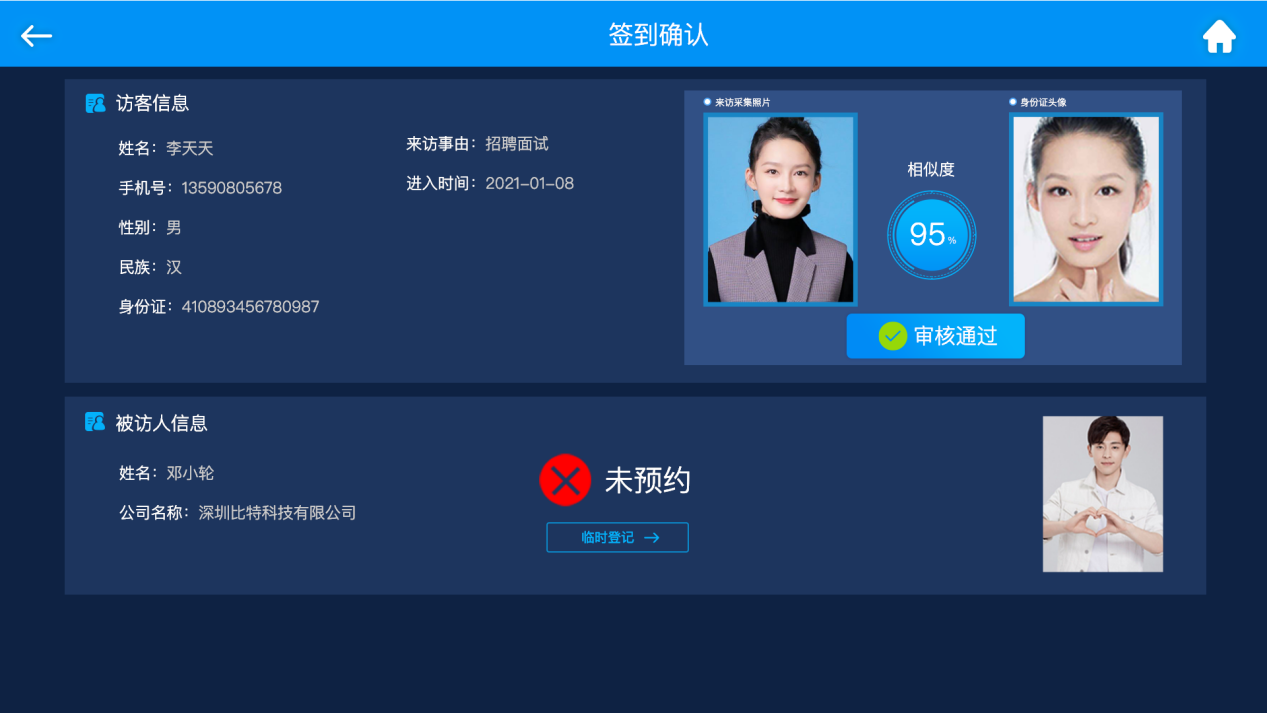 訪客直接刷身份證以后,會進入簽到確認界面。