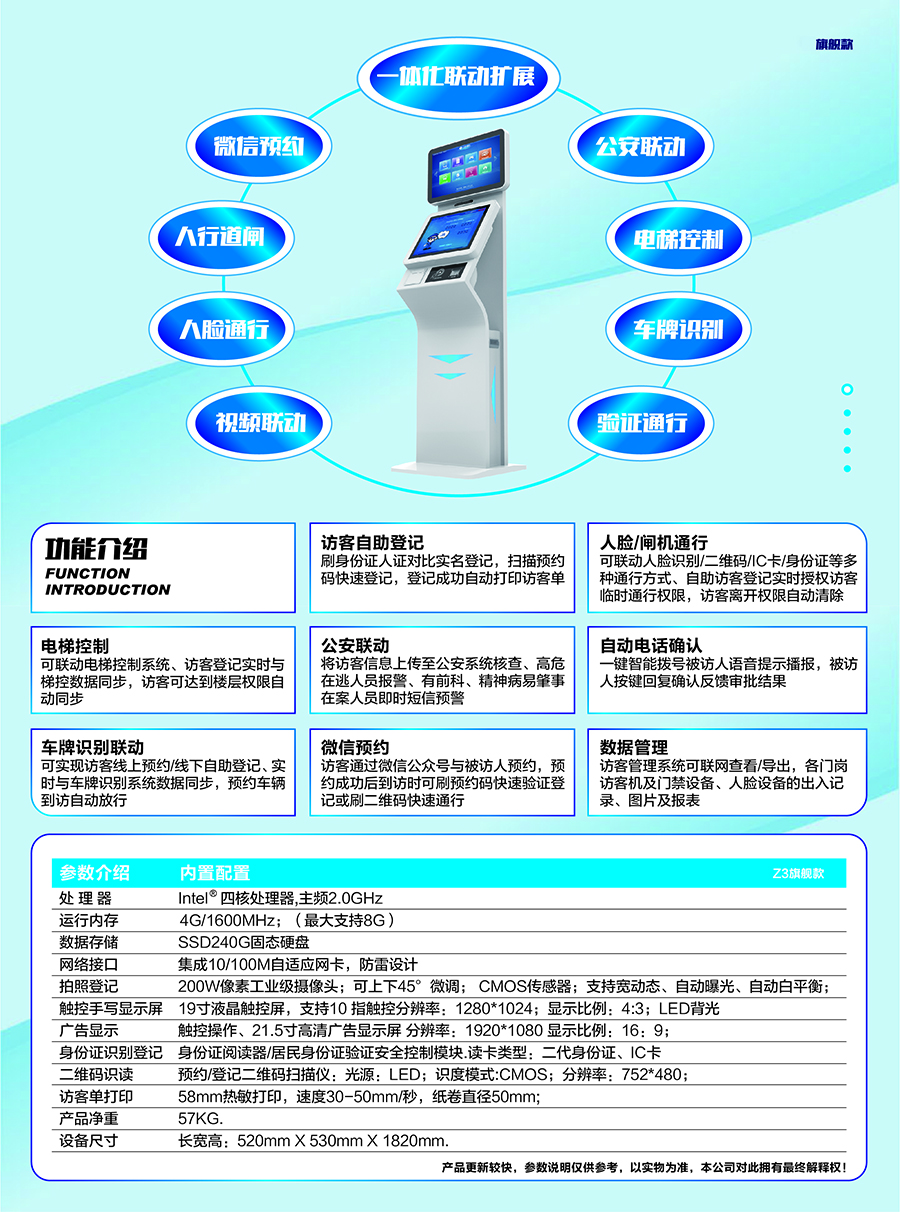 1.電話撥號   2.門禁聯動   3.人行通道閘機   4.電梯聯動        5.網絡攝像頭全景拍照    6.車輛車牌識別控制系統   7.訪客人車微信預約    8.體溫檢測    9.短信發送、確認