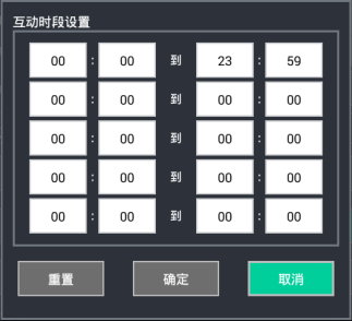 互動時段設(shè)置界面如下圖所示,最多可設(shè)置五個終端機的互動時段,00:00~00:00表示空配置項,00:00~23:59表示全天均可互動。終端機只有在配置的互動時段內(nèi)才可以通過交互觸發(fā)互動節(jié)目的播放。