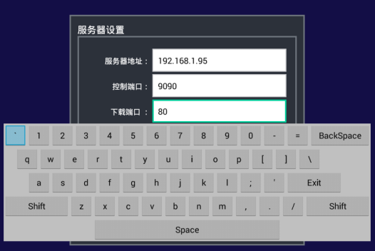 終端服務(wù)器設(shè)置中的服務(wù)器地址為終端需要連接到信息發(fā)布服務(wù)器電腦的IP地址(注:需要填寫電腦實際IP地址,請不要填127.0.0.1的地址)或者域名(域名前請不要添加http://前綴);控制端口為終端實時在線控制服務(wù)端口號如9090;下載端口為內(nèi)容下載服務(wù)器端口號如80??刂贫丝诤拖螺d端口實際上是服務(wù)器端的配置參數(shù),終端需要連接到服務(wù)器就必須和服務(wù)器的設(shè)置端口完全一致。