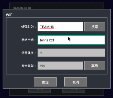 WiFi配置如下面圖片所示,可通過WiFi配置界面的搜索按鈕打開手動搜索界面,通過刷新按鈕更新無線AP列表,并在搜索結(jié)果列表中選擇合適的AP名稱(AP名稱也可以自行手動直接輸入),同時輸入相應(yīng)的網(wǎng)絡(luò)密鑰即可完成WiFi的設(shè)置。如果某些AP不支持DHCP動態(tài)分配IP地址或者網(wǎng)絡(luò)環(huán)境不允許使用動態(tài)IP地址,則可通過高級按鈕進入手動設(shè)置IP地址界面(設(shè)置界面完全類似以太網(wǎng)的手動設(shè)置IP地址界面)。