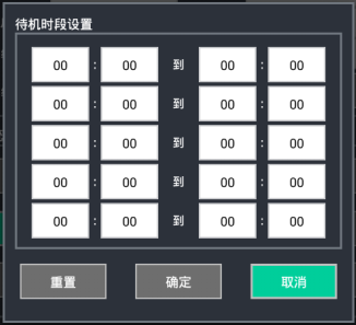 待機時段設(shè)置界面如下圖所示,最多可設(shè)置五個終端機的待機時段,00:00~00:00表示空配置項。終端機一旦進入待機時段時間點則停止播放且輸出黑屏。