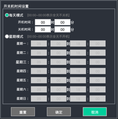 開關(guān)時間設(shè)置用于設(shè)定終端機的定時開關(guān)機時間,包括每天模式和星期模式兩種模式。每天模式指定終端機每天的開機時間點和關(guān)機時間點;全天不關(guān)機則設(shè)定為00:00~00:00。星期模式指定終端機每周天的具體開關(guān)機時間;某個周天不開機則設(shè)定為00:00~00:00。