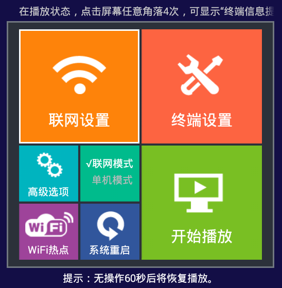 終端后臺設(shè)置界面包括7個子功能按鈕(注:若軟件界面有差異是因為未更新到最新版本,但不影響使用可以忽略):聯(lián)網(wǎng)設(shè)置、終端設(shè)置、高級選項、聯(lián)網(wǎng)/單機模式、WiFi熱點、系統(tǒng)重啟和開始播放。