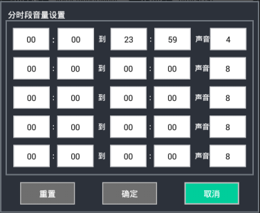 音量設(shè)置界面如下圖所示,最多可指定5個不同時段的音量,默認情況下全天不分時段則只需要指定第一段00:00~23:59的音量值。