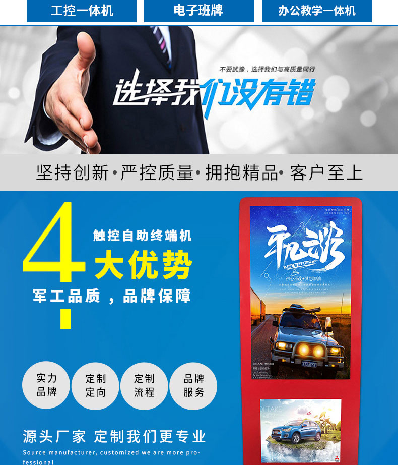 一站式解決方案供應商,來圖來樣加工快速出樣品,提供相關硬件SDK協助開發;專注觸控產品的設計生產,擁有十年設計經驗工程師、技術工程、生產管理人員,以高效品質服務客戶;從供應商的管理,配件的選型,工藝流程的管理各個環節都嚴格把關,通過建立自己的產品質量標準并嚴格執行,確保產品質量可靠;體驗流暢。