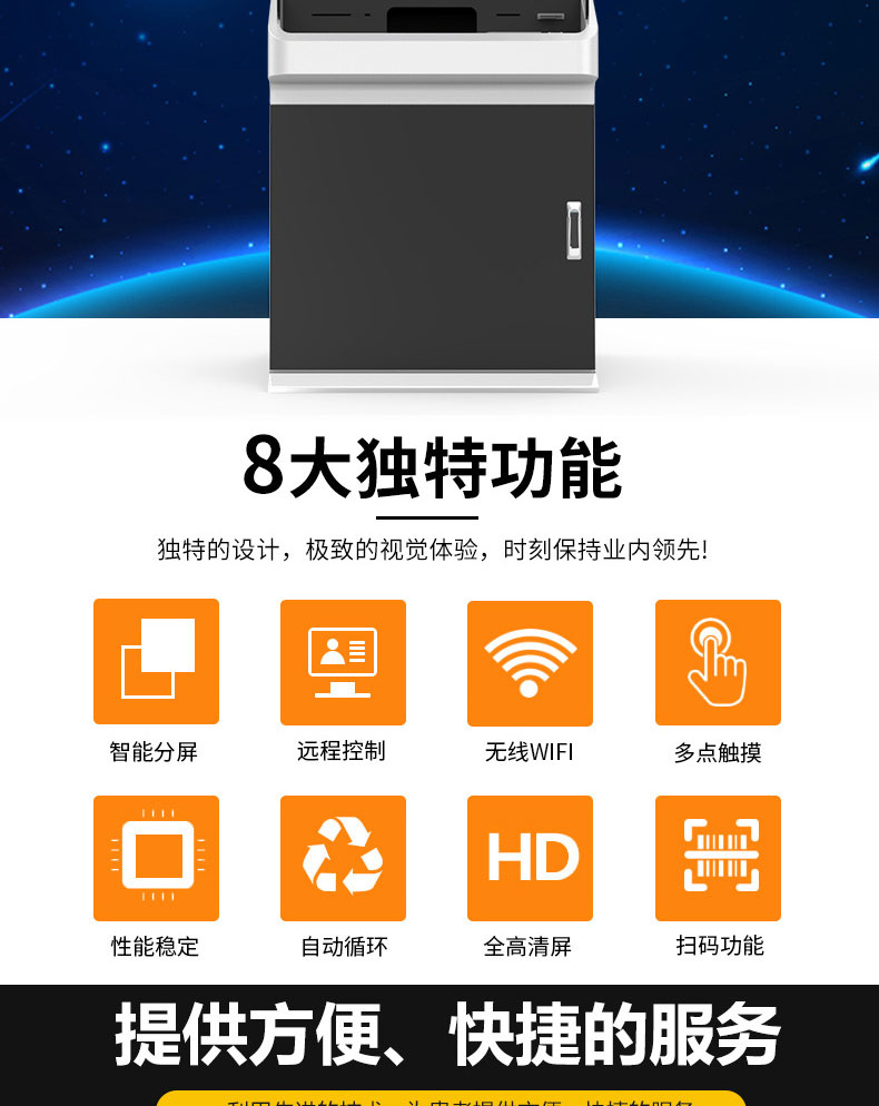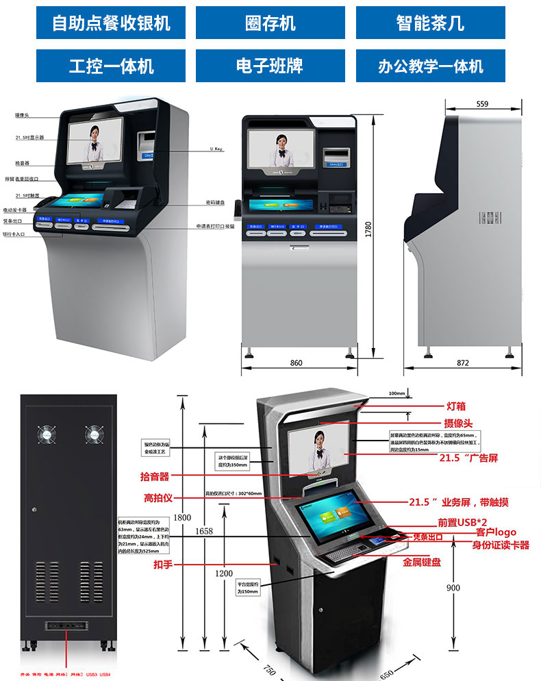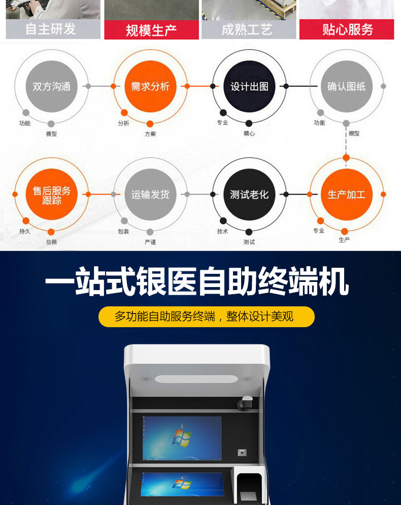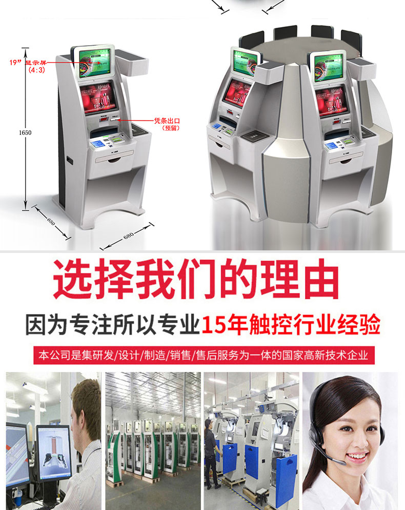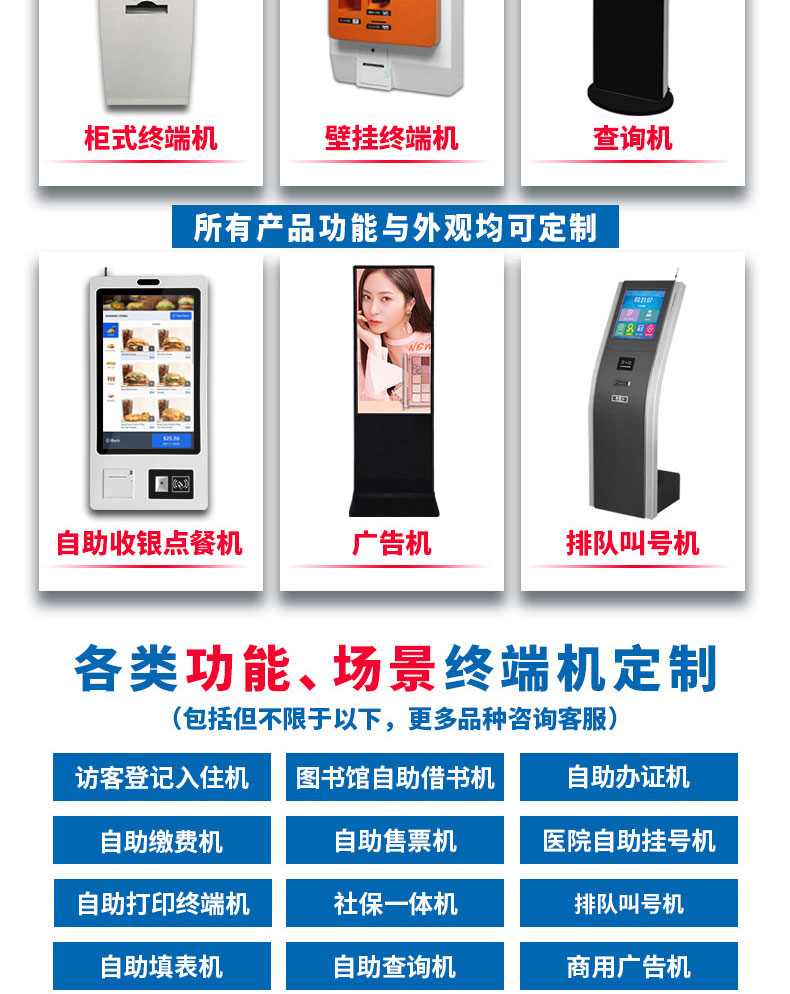 專業提供電腦觸控產品、自助服務終端的設計及生產服務,主要產品自助終端機、自助打印機、自助取票機、自助查詢機、自助繳費機、自助發卡機、自助政務一體機,產品使用于各個行業;醫院、學校、銀行、酒店、景區等。。。。。公司擁有專業的生產線,嚴格的質量把控。耐心的咨詢服務團隊及專業的技術負責團體。