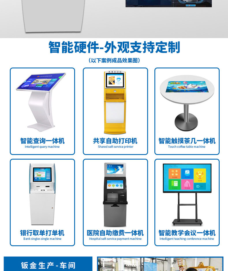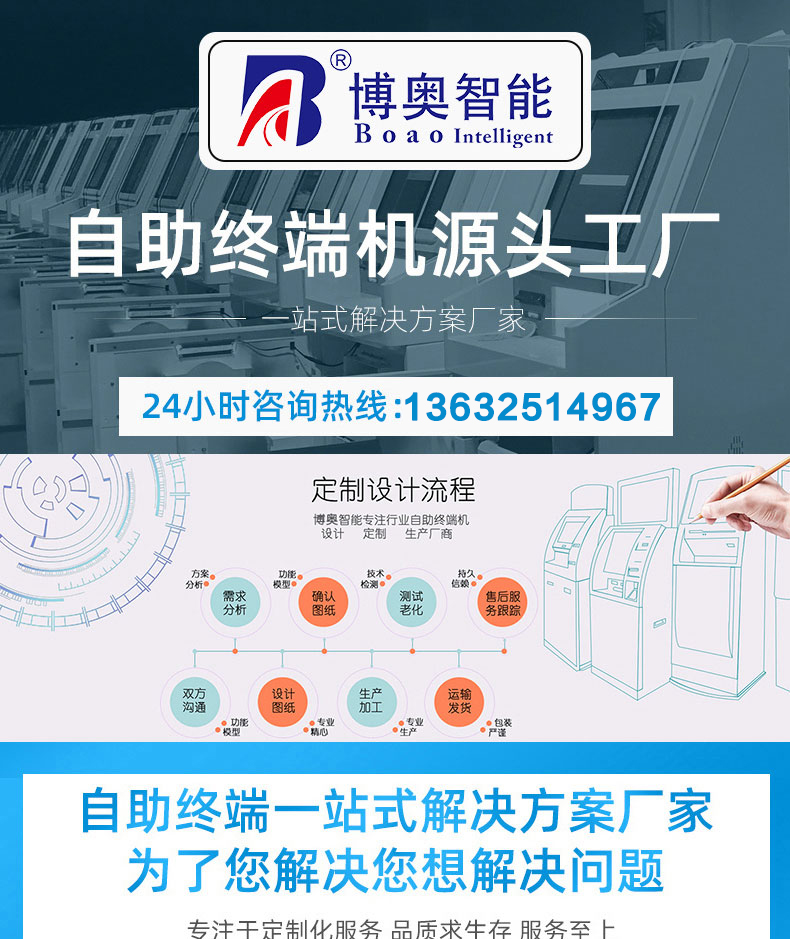 深圳市博奧智能科技有限公司專業提供自助終端機、觸摸查詢一體機、廣告機、液晶顯示器等產品的硬件、軟件研發與設計加工OEM/ODM等一站式服務;我們一直秉承以產品質量為核心、客戶至上、服務共贏為宗旨,為金融、醫療、教育、人工智能、政府工程項目、智慧城市、軌道交通、商業自助服務、廣告傳媒等行業提供質量過硬的產品和優質的服務。