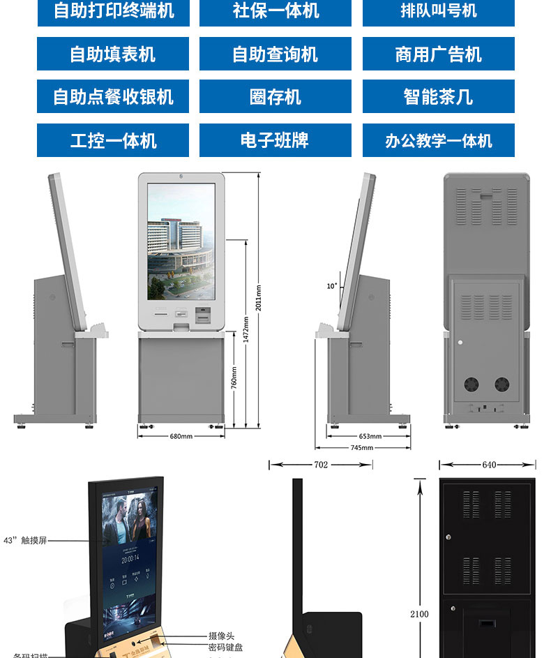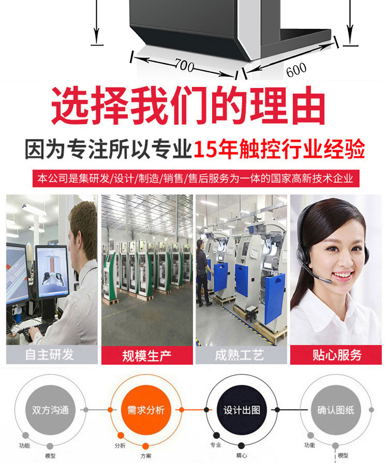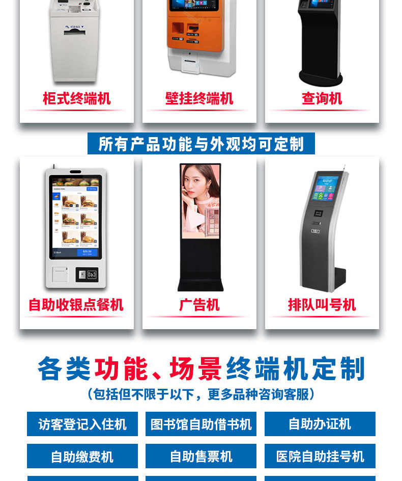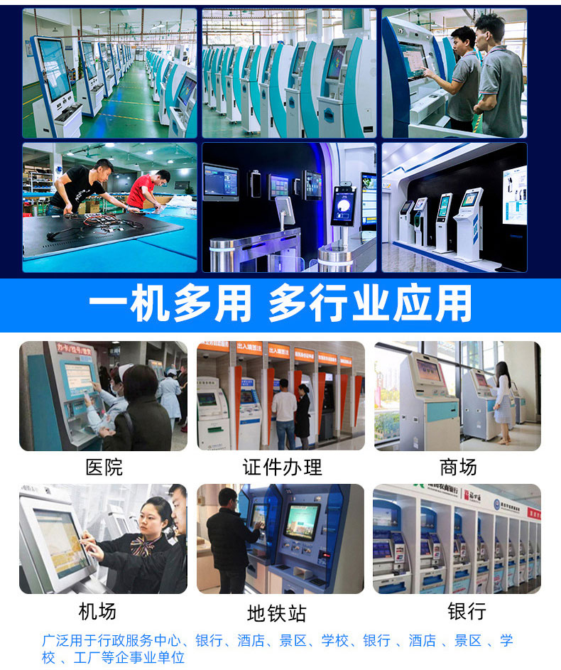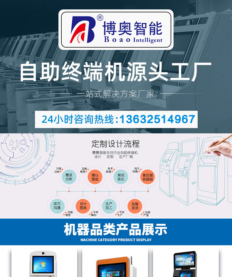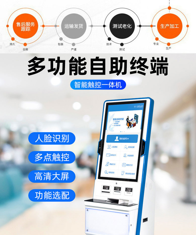 專業(yè)提供電腦觸控產(chǎn)品、自助服務(wù)終端的設(shè)計及生產(chǎn)服務(wù),主要產(chǎn)品自助終端機(jī)、自助打印機(jī)、自助取票機(jī)、自助查詢機(jī)、自助繳費機(jī)、自助發(fā)卡機(jī)、自助政務(wù)一體機(jī),產(chǎn)品使用于各個行業(yè);醫(yī)院、學(xué)校、銀行、酒店、景區(qū)等。。。。。公司擁有專業(yè)的生產(chǎn)線,嚴(yán)格的質(zhì)量把控。耐心的咨詢服務(wù)團(tuán)隊及專業(yè)的技術(shù)負(fù)責(zé)團(tuán)體。