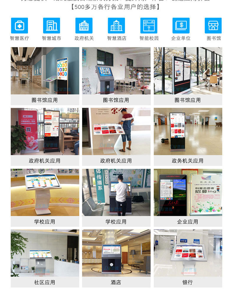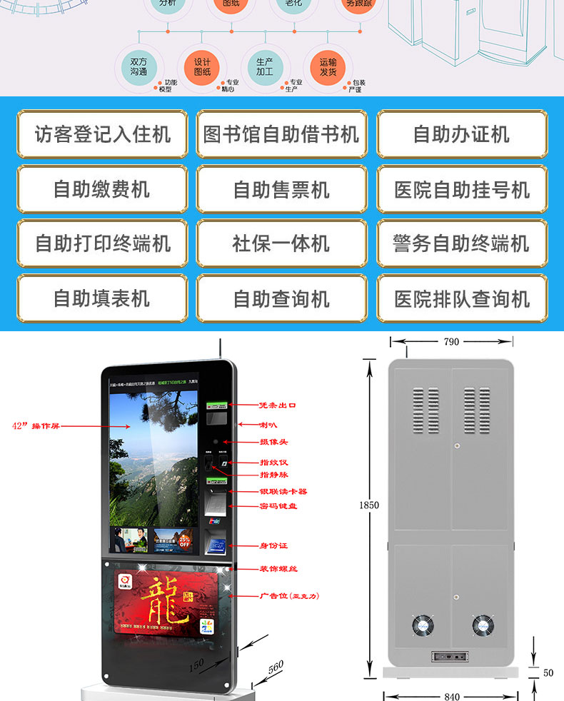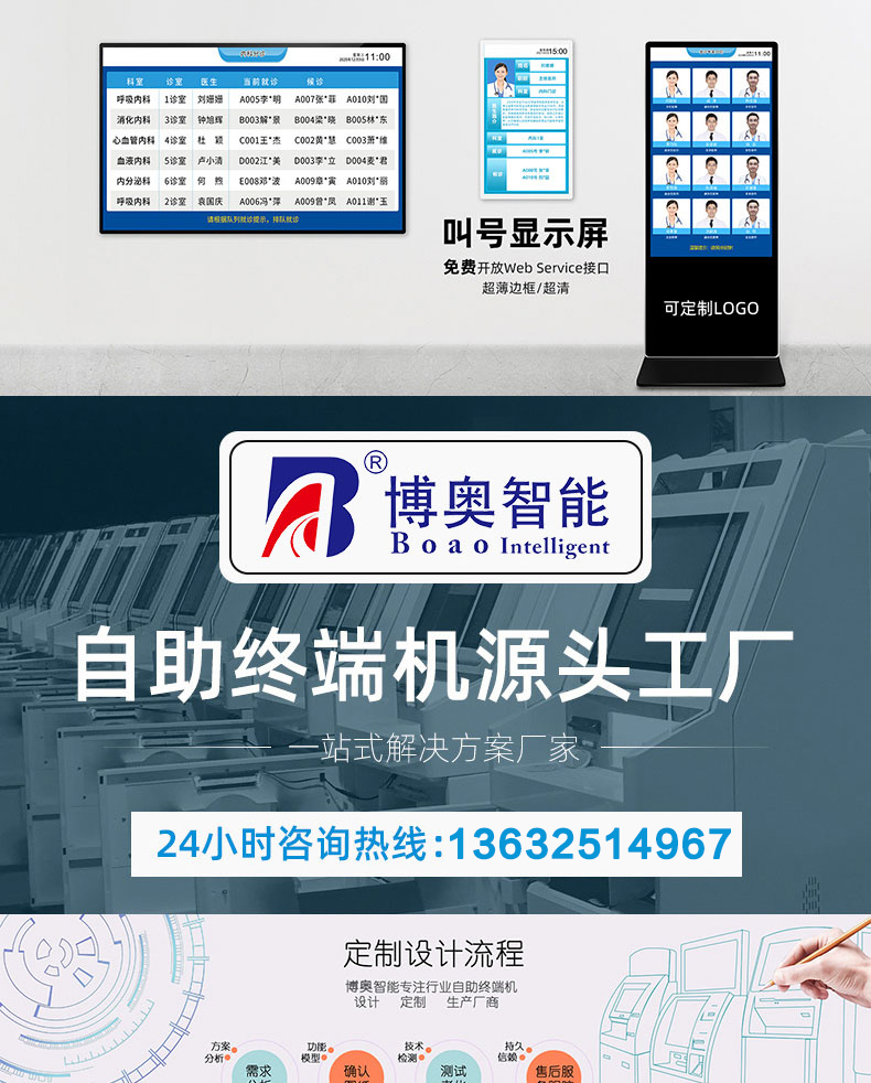 自助終端機定制:定制各種場景各種款式非標終端機;例如訪客機、景區自助取票機、醫院繳費查詢機、醫院自助取單機、社保查詢機、室內外廣告機、排隊叫號機、工控一體機、電力繳費查詢機、圖書自助銷售機、便攜式計算機、酒店自助入住機、自助收銀機等終端。