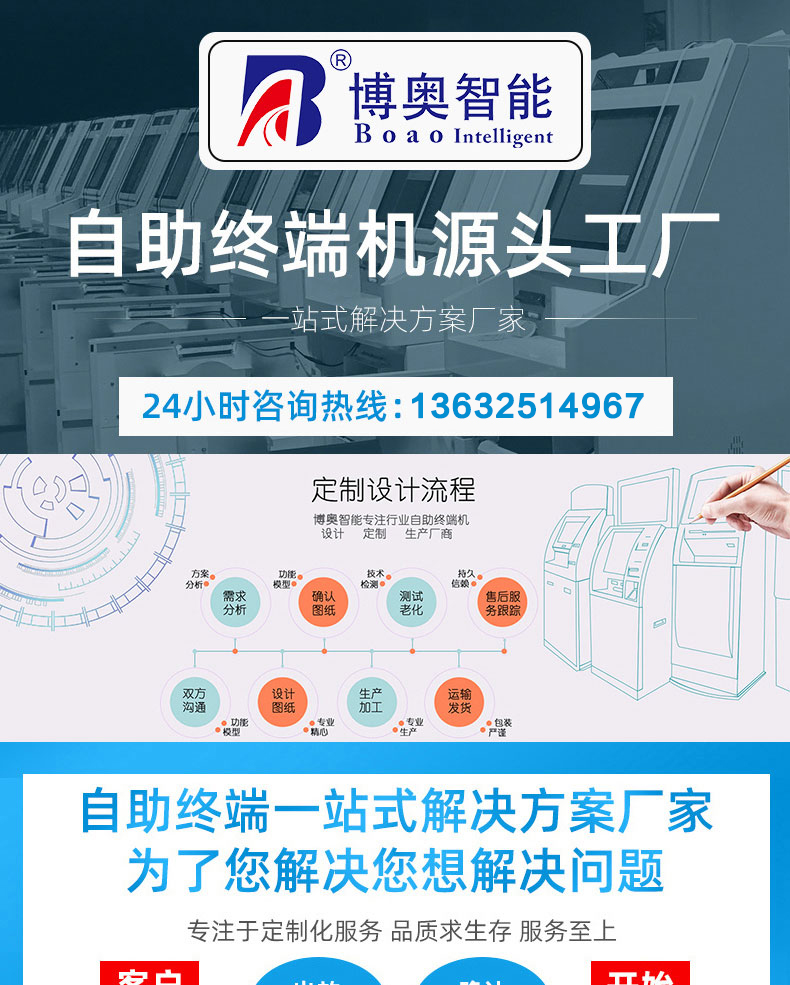 深圳市博奧智能科技有限公司專業提供自助終端機、觸摸查詢一體機、廣告機、液晶顯示器等產品的硬件、軟件研發與設計加工OEM/ODM等一站式服務;我們一直秉承以產品質量為核心、客戶至上、服務共贏為宗旨,為金融、醫療、教育、人工智能、政府工程項目、智慧城市、軌道交通、商業自助服務、廣告傳媒等行業提供質量過硬的產品和優質的服務。
