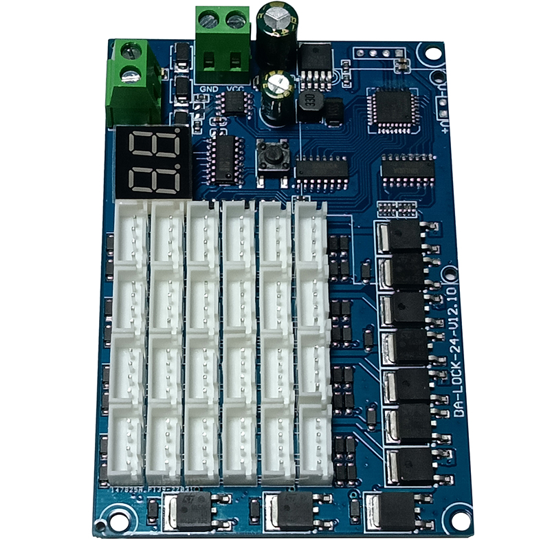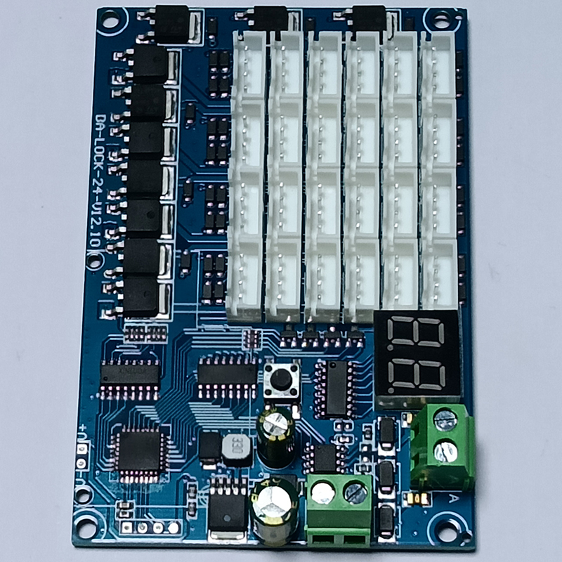 24路鎖控板又名為電子鎖控制模塊,主要用來控制各類格子柜門電子鎖的開與關,板子集成24路鎖控杜邦接口,485通信接口,DC電源接口,鎖控地址顯示模塊,一鍵全開功能!板子通過485通信協議,實現電腦串口助手發送數據開鎖和獲取箱門狀態反饋!