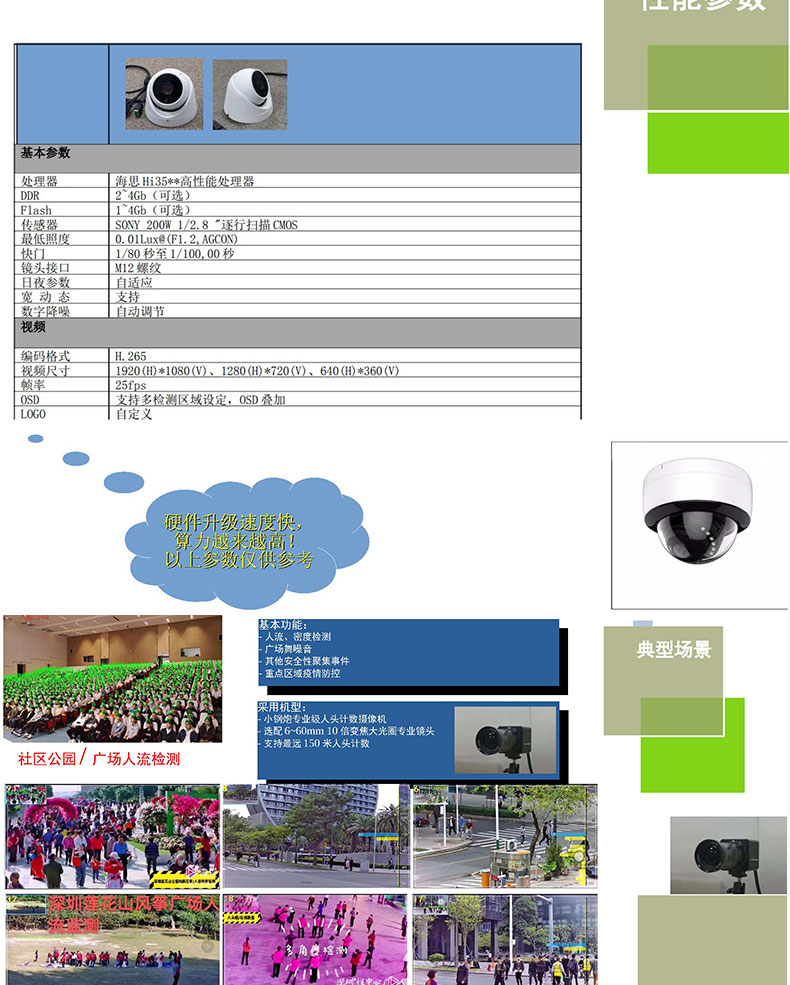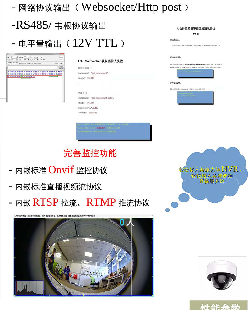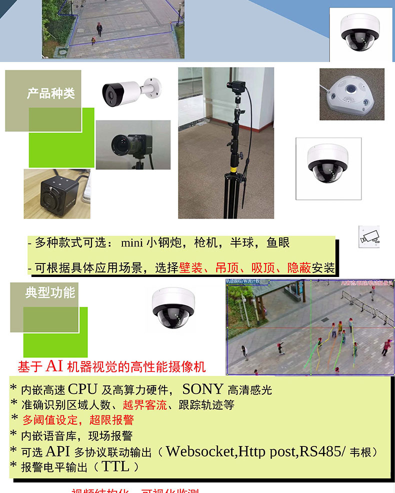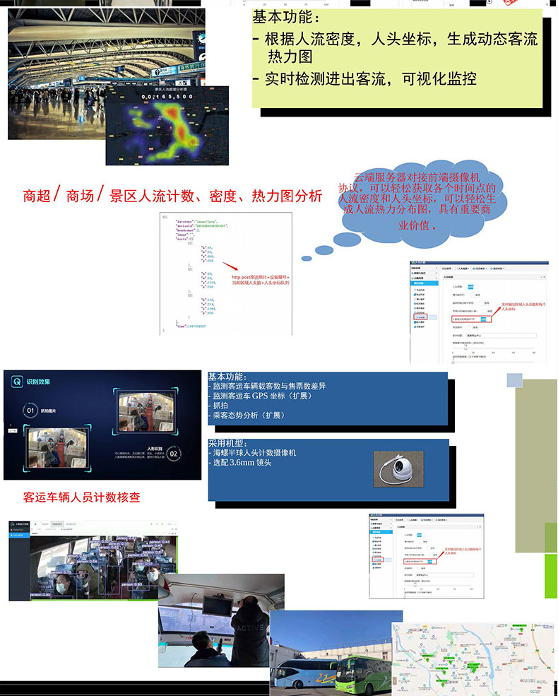智能AI攝像機采用領先的視覺技術,獲取目標的深度信息,結合智能跟蹤算法分析行人的行為軌跡,對計數區域進行分塊處理,計算各區塊邊界線上人員通行的方向及人數,實現高精度的客流統計效果;廣泛應用到商場超市景區客站臨時活動等場所用來智能監控;客流人數統計及軌跡跟蹤。攝像機是把光學圖像信號轉變為電信號,以便于存儲或者傳輸的一種機器。當我們拍攝一個物體時,此物體上反射的光被攝像機鏡頭收集,使其聚焦在攝像器件的受光面上,再通過攝像器件把光轉變為電能,即得到了“視頻信號”,有的公交車上通過安裝攝像機來拍攝記錄上下車的行人,再通過車載設備統計實時經過攝像機的客流量,因此攝像機是客流量統計系統中的重要一個部件。傳統的攝像機一般安裝在公交車車廂內部的車頂,由于每個公交車的內飾有區別,有的攝像機可以直接安裝在車廂內壁,有的只能采用懸掛的方式進行安裝,因此不同的車輛需要搭配不同的攝像機使用,攝像機的安裝適用范圍較窄,雖然有的攝像機內部安裝減震結構防止攝像機抖動,傳統的減震結構一般采用彈簧或者橡膠墊減震,使用一段時間后彈簧容易變形或者橡膠墊易老化,導致減震效果變差。