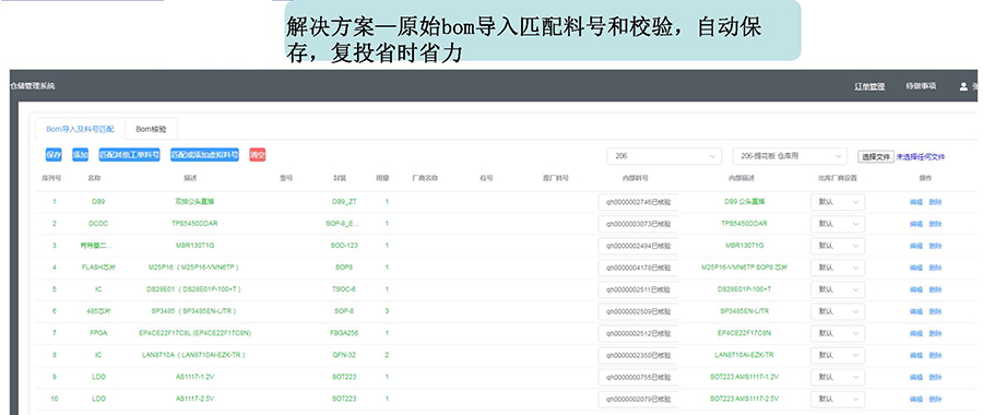 2.導入BOM,自動匹配料號,人工批量料號,復核料號。