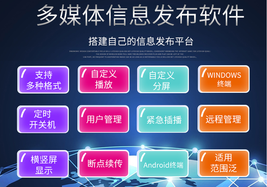 信息導引及發(fā)布系統(tǒng)是一個用于數(shù)字化媒體內(nèi)容發(fā)布與播放的專業(yè)系統(tǒng),該系統(tǒng)可以替代張貼海報、播放文件等舊的宣傳方式,將需要宣傳和發(fā)布的內(nèi)容以數(shù)字化的方式編輯制作,然后通過網(wǎng)絡化的方式傳輸?shù)街付ǖ慕K端設備上進行播放,并以信息化方式進行集中管理,以達到信息內(nèi)容的指定發(fā)布、實時更新和集中管理目的。