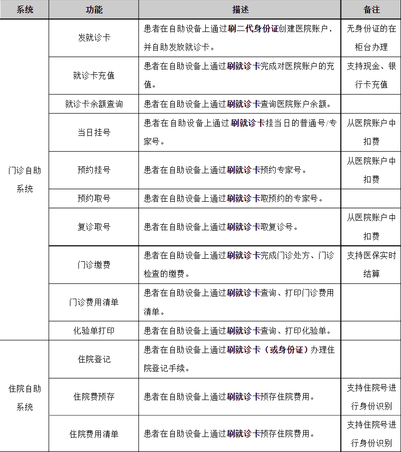 新增門(mén)診自助系統(tǒng),通過(guò)投放自助服務(wù)終端(含機(jī)上軟件),實(shí)現(xiàn):?發(fā)就診卡、就診卡充值、就診卡余額查詢(xún)、當(dāng)日掛號(hào)、預(yù)約掛號(hào)、預(yù)約取號(hào)、復(fù)診取號(hào)、門(mén)診扣費(fèi)、門(mén)診退費(fèi)、門(mén)診費(fèi)用清單打印、化驗(yàn)單打印等功能。