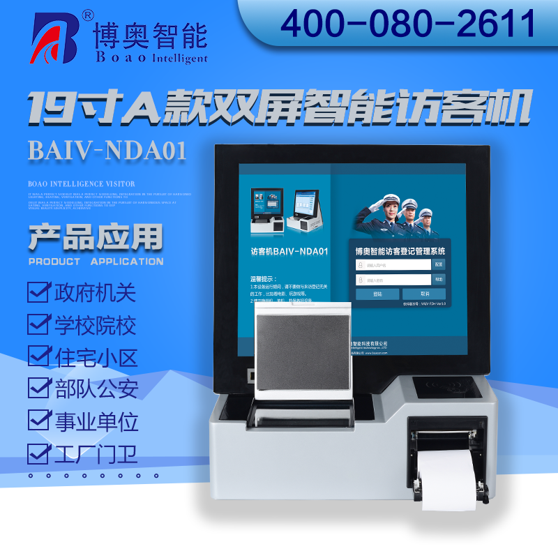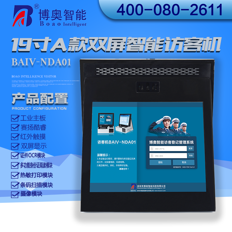 ? ? ? 19寸A款雙屏智能訪客機是博奧智能自主開發,采用人體工程學與模塊化設計相結合,融合計算機、觸摸屏手寫、證件識別(OCR),射頻識別、指紋生物識別、熱敏打印、條碼、數碼攝像、自動制證、硬件加密、網絡等技術;選用鈑金材料、表面噴粉工藝加工出來的一款訪客管理終端,訪客管理終端內部裝有WIN7操作系統 SQL Server數據庫及我公司自主開發的訪客登記管理軟件等主要軟件,從而匯集成了一套完善的智能訪客登記管理系統,它具有外觀精美,功能完善,操作方便等特點。