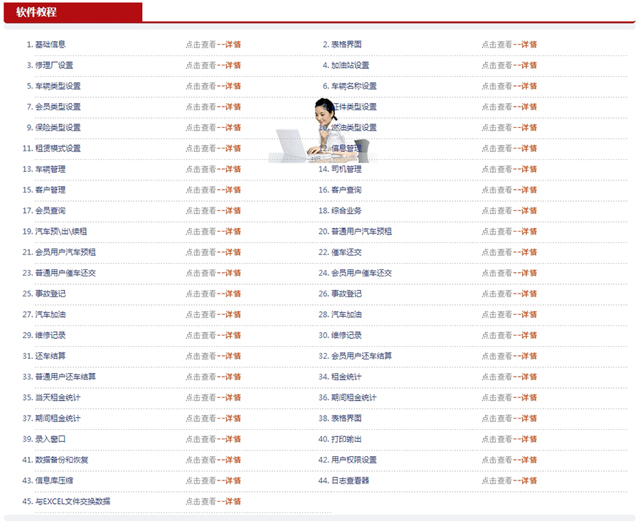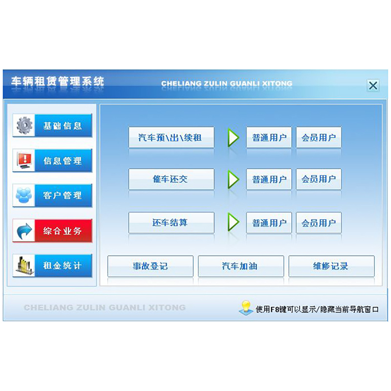 綜合業務:汽車預出續租、催車還交、事故登記、汽車加油、維修記錄、還車結算;