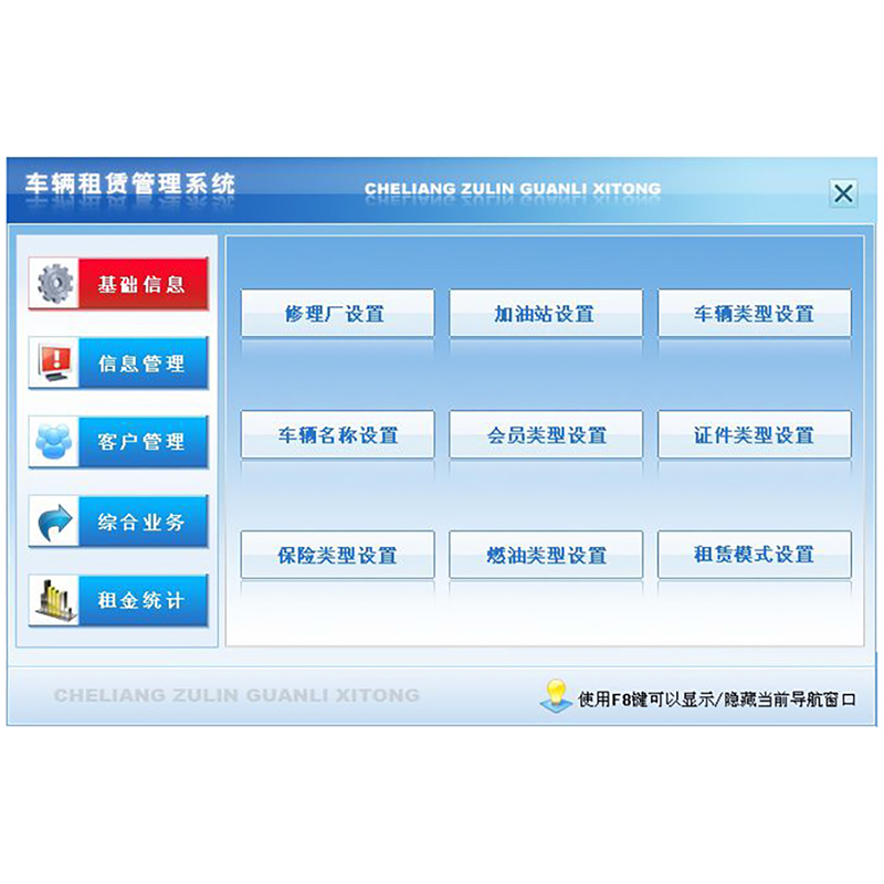 基本信息:修理廠設置、加油站設置、車輛類型設置、車輛名稱設置、會員類型設置、證件類型設置、保險類型設置、燃油類型設置、租賃模式設置;