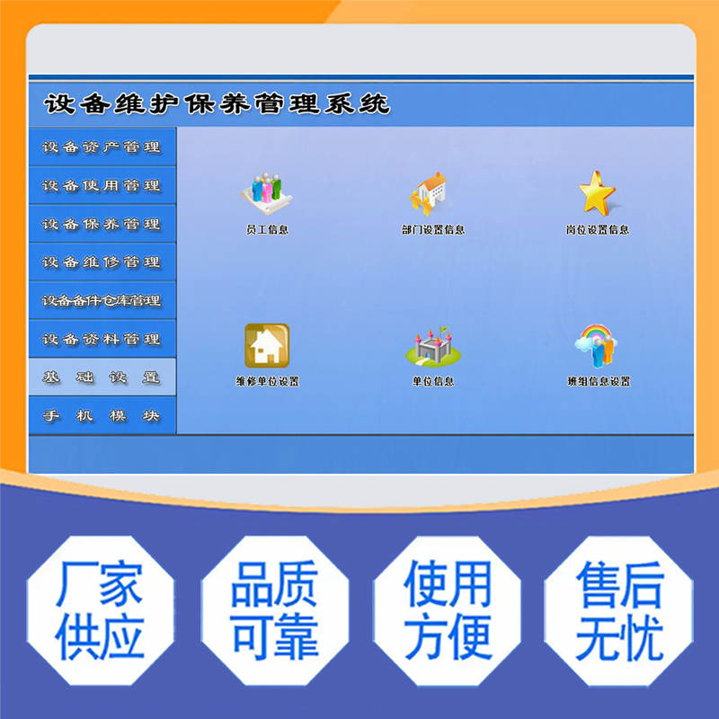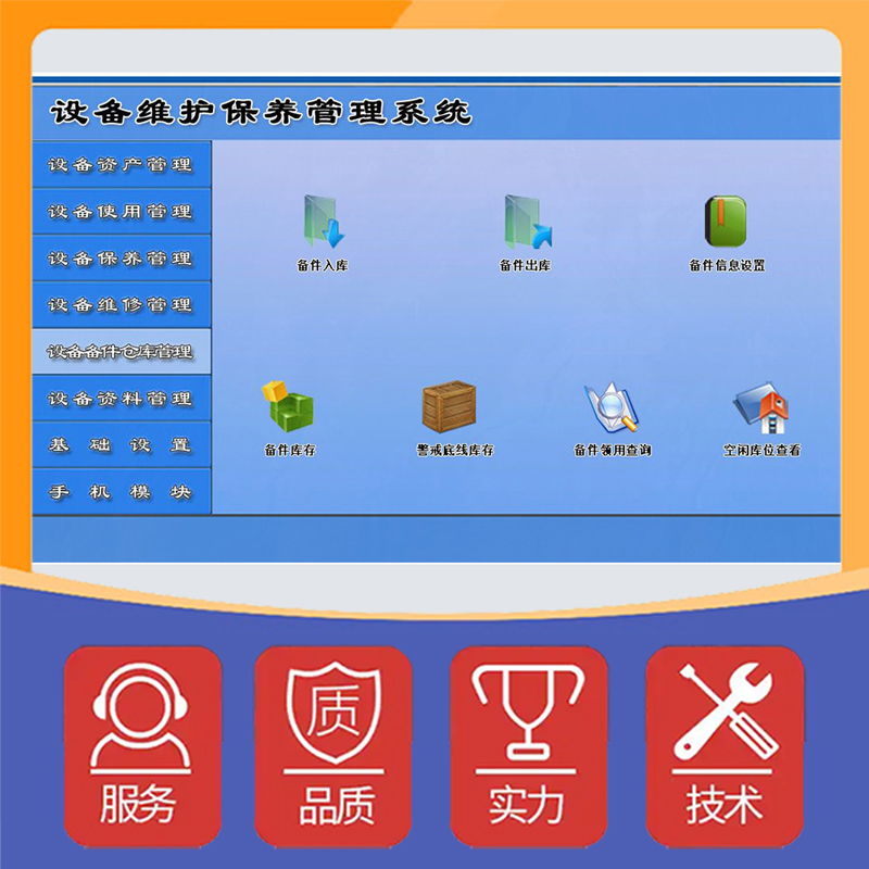《設(shè)備維護(hù)保養(yǎng)管理系統(tǒng)》是一款全面管理設(shè)備資產(chǎn)、使用、保養(yǎng)、維修、備件及資料的軟件系統(tǒng)。該系統(tǒng)致力于幫助企業(yè)提高設(shè)備管理效率,降低設(shè)備維護(hù)成本,延長(zhǎng)設(shè)備使用壽命。系統(tǒng)涵蓋了設(shè)備資產(chǎn)管理、設(shè)備使用管理、設(shè)備保養(yǎng)管理、設(shè)備維修管理、設(shè)備備件倉(cāng)庫(kù)管理、設(shè)備資料管理、基礎(chǔ)設(shè)置和手機(jī)模塊,可對(duì)設(shè)備的狀況進(jìn)行全面管理,使用戶(hù)能夠及時(shí)了解設(shè)備的最新?tīng)顟B(tài),提高工作效率。