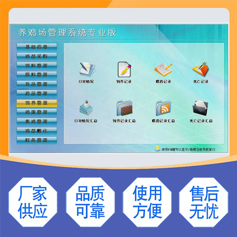 《養雞場管理系統專業版》是一款適用于中小型養雞場的管理軟件。主要包含基礎信息、雞苗采購、飼料管理、原料管理、貨品管理、藥品管理、飼養管理、雞蛋管理等功能。本管理系統多處具有快速輔助錄入功能,操作簡單,易學、易用;處理功能高效強大,是協助您的好幫手!