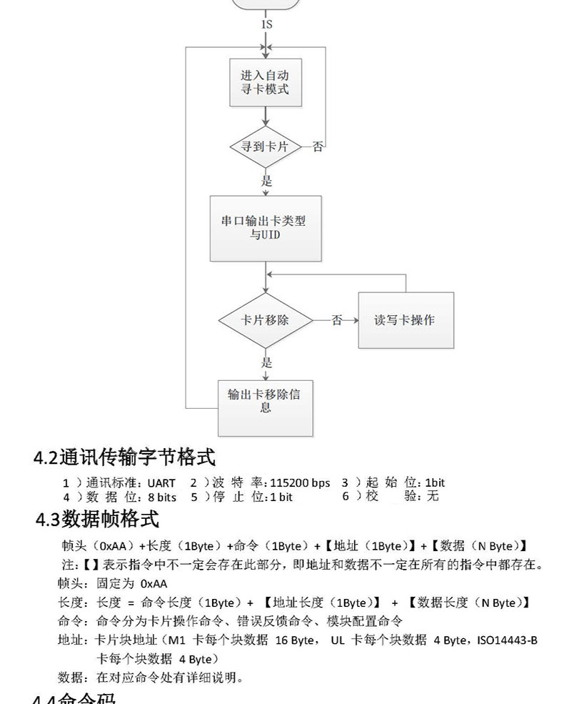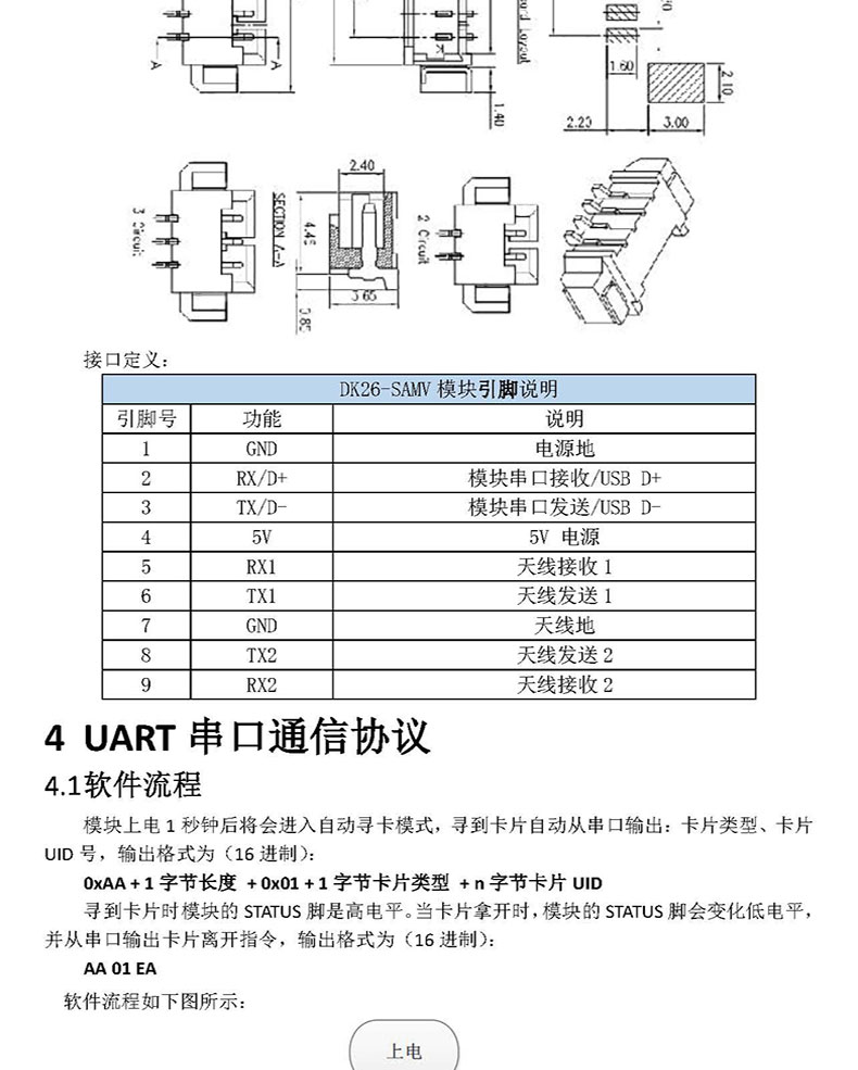 模塊采用 UART 通訊接口(可選 USB),兼容性好,通用性強(qiáng)。用戶通過 UART 向模塊發(fā)送簡單指令可實(shí)現(xiàn)對卡片進(jìn)行讀/寫操作,簡單易用,用戶可使用該模塊高效快速開發(fā)高頻讀寫功能產(chǎn)品。